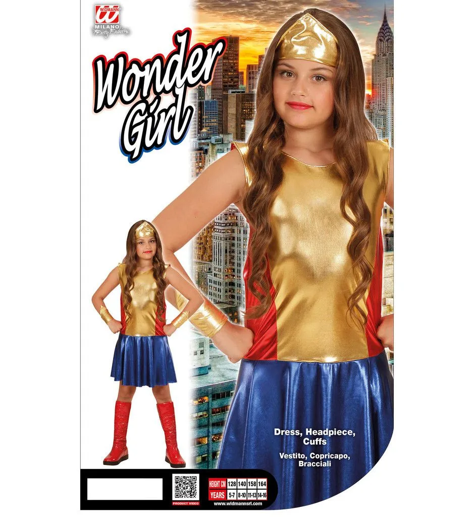 Het is eigenlijk best oneerlijk dat de meeste superhelden mannen zijn. Alleen echte stoere meiden kunnen daar verandering in brengen. Zeker als ze als Superheldin Wonder Girl ergens voor de dag komen. Superman en al die andere helden kunnen wel inpakken zodra jij deze kleding hebt aangetrokken. Een kostuum dat de kleine dames zeker geen windeieren zal leggen. En dat schitterende hoofdstuk en die leuke manchetten maken dit kleurrijke pak natuurlijk helemaal af.